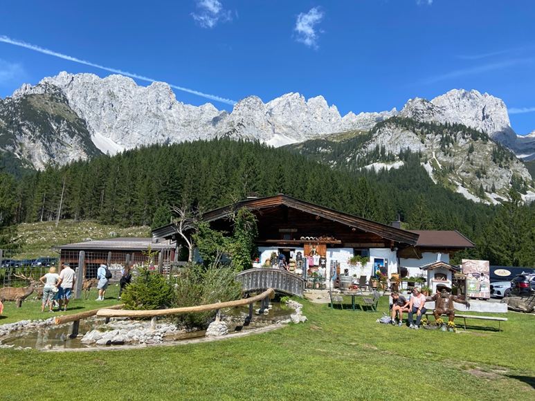 Da die morgendliche Anfahrt mit dem gemieteten Bus wieder an Ellmau vorbeiführte, war die Wochenbrunner Alm, wie bereits im Vorjahr, unsere erste Wahl für ein typisches Tiroler Mittagessen. Bei schönstem Bergwetter genossen wir die Aussicht auf den Wilden Kaiser.