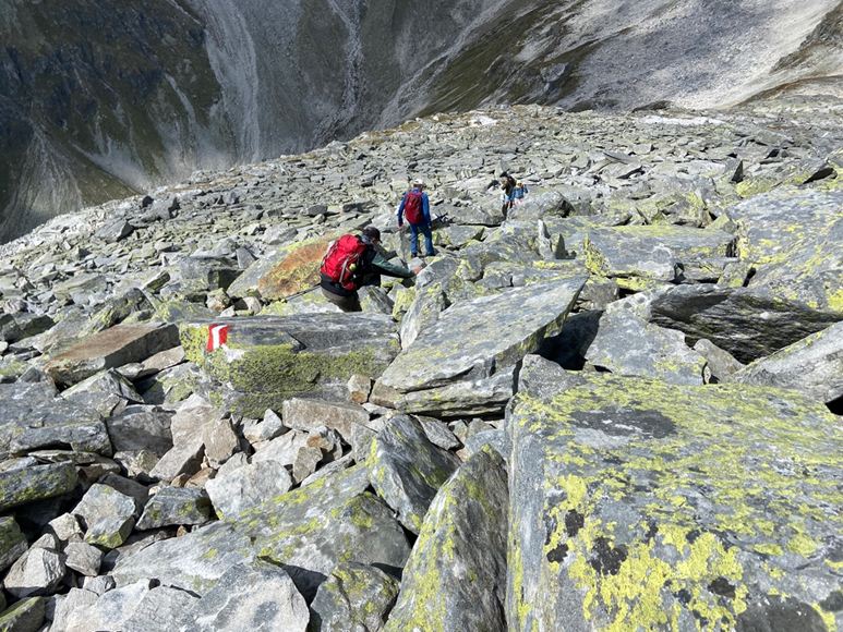 Über weite Geröllfelder mit teilweise riesigen Felsbrocken und tiefen Spalten ging es Schritt um Schritt Richtung Gipfel. Die Wegmarkierungen waren teilweise nur schwer zu entdecken und so manches Mal zwang eine Sackgasse zur Rückkehr. Zur Mittagszeit war es dann aber geschafft, und der Ausblick ließ den mühsamen Aufstieg schnell vergessen.