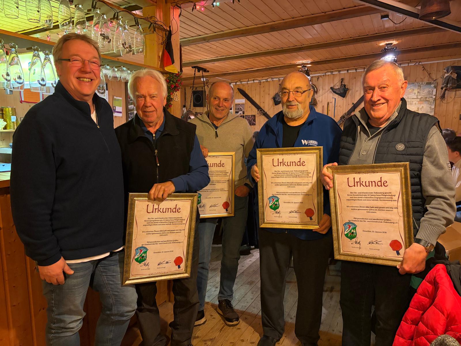 Darüber hinaus erhielten 4 weitere Mitglieder eine Ehrenurkunde für 40-jährige aktive Vereinstätigkeit. Die Vereinsmitglieder Georg Körner, Jürgen Nebl, Harald Koch und Robert Wirth wurden durch eine Laudatio gewürdigt, die unser Bürgermeister Klaus Schumann hielt, und bekamen jeweils eine gerahmte Ehrenurkunde überreicht.